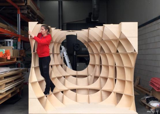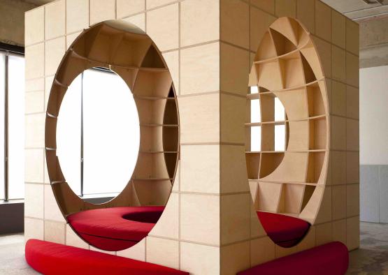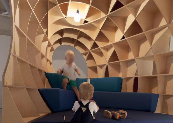 Reusable and recyclable, Play Pods deliver a set of immersive educational play spaces, each comprising 250 intersecting layers of birch plywood.
