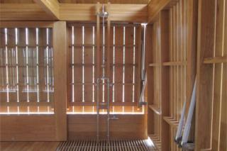 Below the eaves, shutters and cladding formed of open jointed timber planks enclose the six central bays. This enclosure comprises a weather tight internal space of four bays and a semi-enclosed storage area.