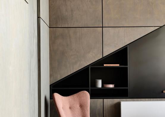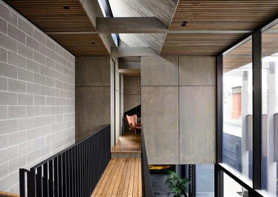 The interior palette is a rich and modern one. Slate tiling extends from inside to outside, creating a unique feeling of outdoor living in the enclosed kitchen environment. Hoop pine plywood was used as panels for the roof and walls, creating a warm and natural balance to the sleek modern metalwork in the kitchen. A grey stain was added to the plywood to give it a luxurious and restrained finish that better complemented the other materials. Blackbutt handrails, treads and flooring continue the flow of timber along the staircase and bridge above.