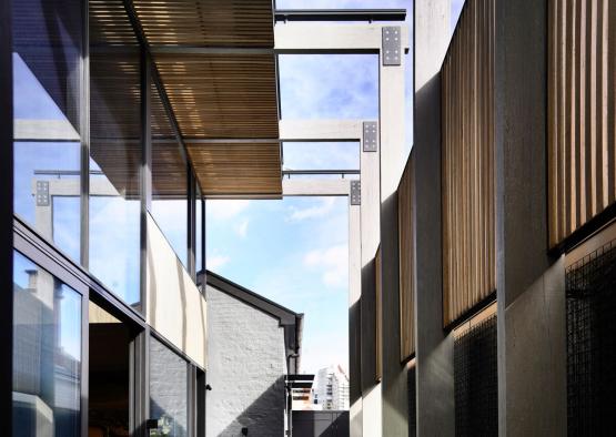 Spotted Gum and Blackbutt battens create a sculptural roof form above the double height space. The beautiful and functional open roof pattern above the kitchen void allows extra light to flood the towering space. The high windows in the roof form allow cool southerly breezes to be directed in to the residence over the neighbouring house.