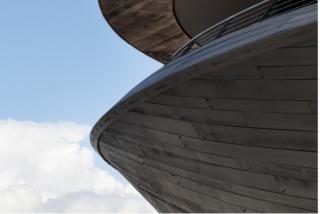 The simple, pure elliptical form of the building is based on toroidal geometry and echoes the shape of the vessel. The main building is clad in western red cedar planks of various lengths and widths, stained and laid to mimic the carvel boat construction method of the 16th century, where timbers were fixed with a minimal joint to allow expansion and to avoid overlapping.