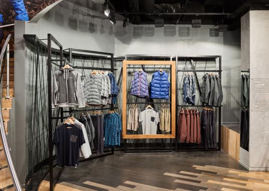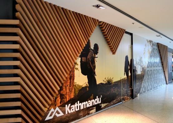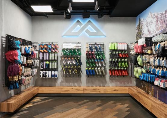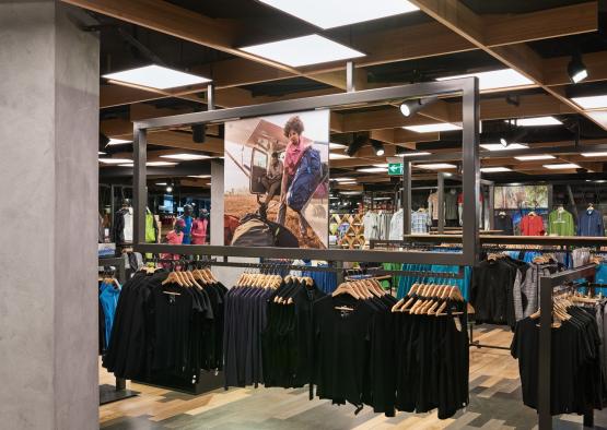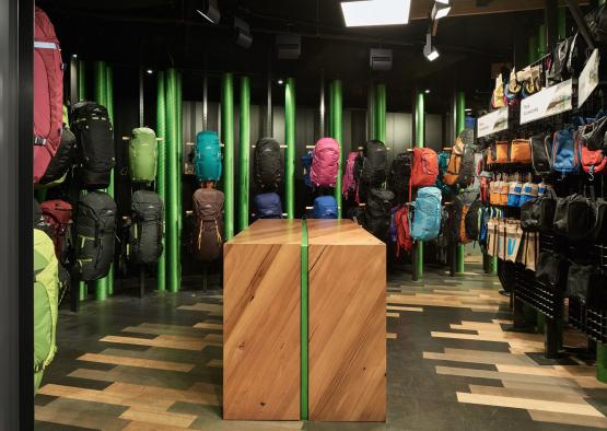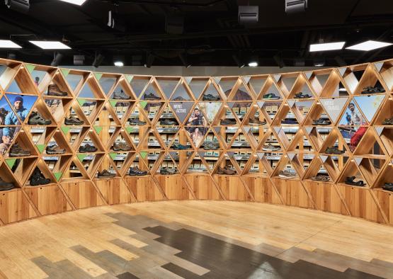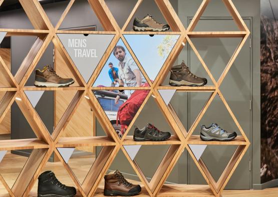 Katmandu's flagship store in Melbourne’s Elizabeth Street heroes timber more than any other material, reflecting the brand ethos by showing a dedication to sustainability, a connection to the outdoors and the use of authentic materials. The shopfront is lined with timber battens that angle together to draw the customer in and under them. The canopy above of intersecting timber beams lines the ceiling whilst the gradient painted timber floor provides the platform for the various retail zones. These two elements work harmoniously together to provide a sense of movement; a changing terrain which is reminiscent of typography found in the natural landscape. Throughout the various themed zones timber has been extensively used, in particular, the ‘Shoe Wall’ where a series of interlocking triangles create niches for display and graphic content.