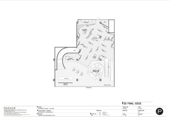 Floor Covering: Messmate with painted sections to mimic a gradient using tongue and groove. 77% of tenancy uses the specified timber floor covering. The ground floor (400.1m²) uses a total timber covering of 348.71m². The first floor (703.9m²) uses a total timber covering of 551.7m².