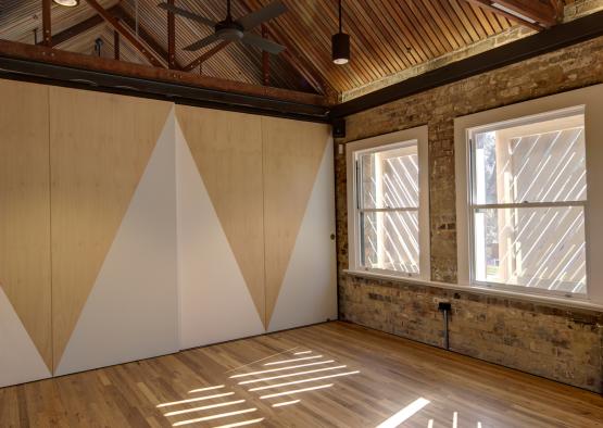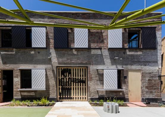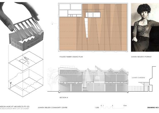 The Juanita Nielsen Community Centre occupies a former warehouse in Woolloomooloo. It was named after the infamous local activist Juanita Nielsen, when converted to a community centre in 1983. The project is a major upgrade to this existing Centre. The architecture works to rejuvenate the building as a social place without sanitising or gentrifying it. The1888 heritage fabric is retained, up-cycled and celebrated. Timber is key – an original material and sustainable resource, with perceptible warmth and general community appeal. Timber is the primary material of the upper floor where old herringbone timber floor structure is revealed. The new roof and acoustic ceiling are also timber, visibly stretching across the whole of the upper floor. The precise ceiling geometry contrasts the roughness of old brick walls. Its distinctive zigzag motif recurs throughout, in timber doors and external shutters, playfully resonating with the striped top of Juanita in her famous portrait.