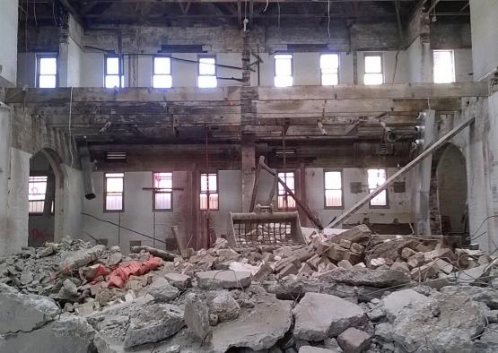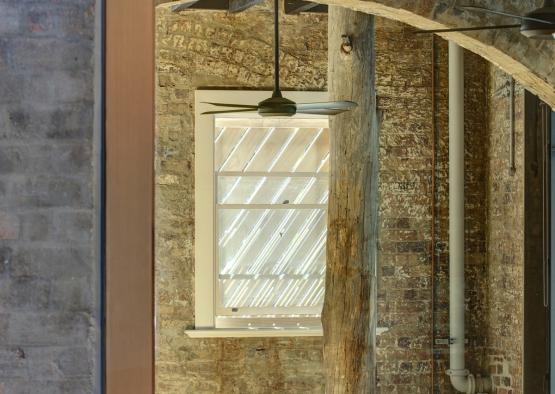 Floor System: Glulam, 290 x 70mm sawn-cut Tasmanian oak. The refurbished internal floor joists were augmented with matching replacement joists and herringbone strutting where required and black stained finished. The new floor was built up to provide acoustic separation including 90mm pine battens, one layer of 9mm FC sheet, 19mm marine plywood substrate and floorboards.