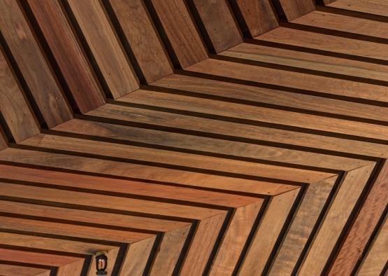 Ceiling Lining: 60 x 12 DAR spotted gum ceiling lining over acoustic installation was installed to achieve a 25% opening. The existing internal ceiling joists were refurbished and stained finished.