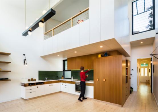 The project combines open plan living with areas for retreat. The open-plan kitchen/living space is overlooked by a cosier mezzanine level for quiet reading, listening to music & yoga. The internal finishes palette for the house is warm, natural tones with a focus on ‘green’ and timbers complimented by crisper, airier whites.