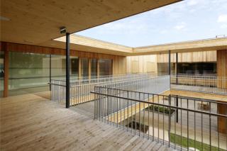 The two-storey building consists of four wings arranged around a semi-public “village square”, designed to host various events. This is also the location of the roofed vestibule, the central nurses’ station, an oratory, a cafe, a hairdresser as well as an open, tended atrium.