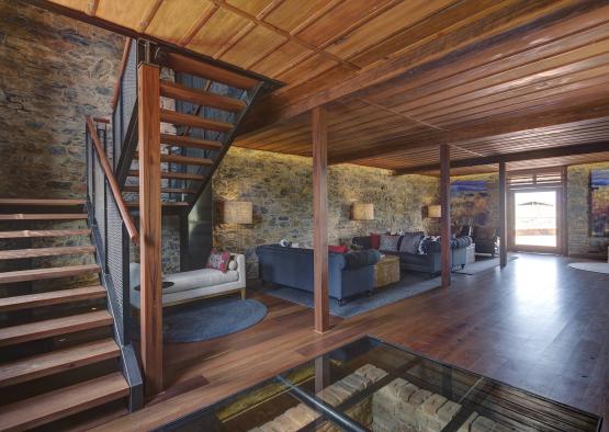 The Stone Store is an allegory of the beauty of timber and its fundamental strength as a building material. The interior has been designed to enhance the distinct character of the original building. Two levels of large open-plan spaces provide flexible accommodation for function events. Extensive use of natural timber from the floors, to the ceilings, posts, beams, doors, window and lintels, juxtaposed with the exposed stone walls and blackened steel elements, achieve a memorable impact.
