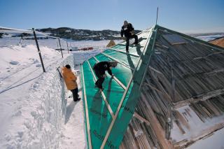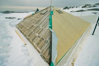 Since 1997, the Mawson's Hut Foundation has organised and financed several major expeditions - recladding the main hut, with its distinctive pyramidal roof over a square plan with verandahs on three sides, enclosed to provide storage and insulation space.