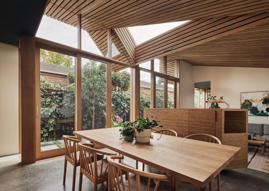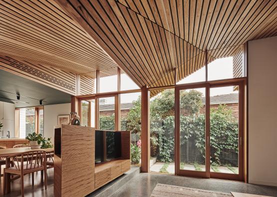 The sculptural timber ceiling is far from being just for show, carefully peeling up to always maintain the aspect to the northern gardens. All spaces have strong visual connections to the garden, with the windows stepping to allow a view from the front, all the way down to the rear of the garden, which features large trees for natural shading.