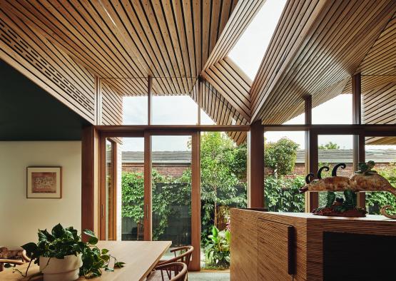 The undulating timber ceiling is lined with battens of silvertop ash, a native Australian hardwood with good exterior durability and excellent fire resistance.