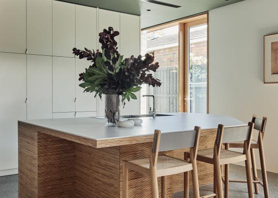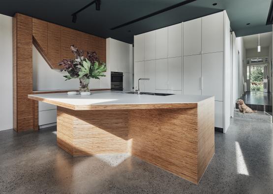 The cabinetry balances ample use of edge grain plywood with crisp white finishes, always referencing the strong angles of the roof above. The island bench is broader than usual, creating an intuitive gathering area for informal entertaining.