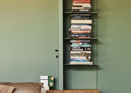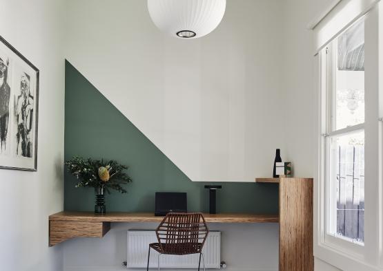 Between the walk-through robe is a masterful ensuite featuring a plywood vanity contrasting with eucalypt coloured tiling. Eucalypt colouring is a feature of the extension, matching brilliantly with the natural hardwoods, echoing and connecting with the colours of nature outside.