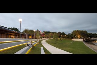 The space offers open views of the river and city, passive daytime seating under the shade of native subtropical trees and a broad, flat lawn area for informal recreation.