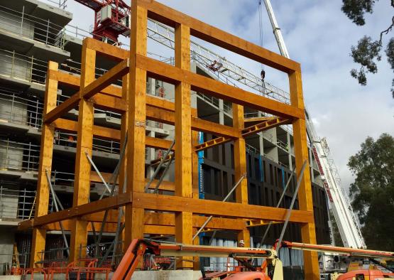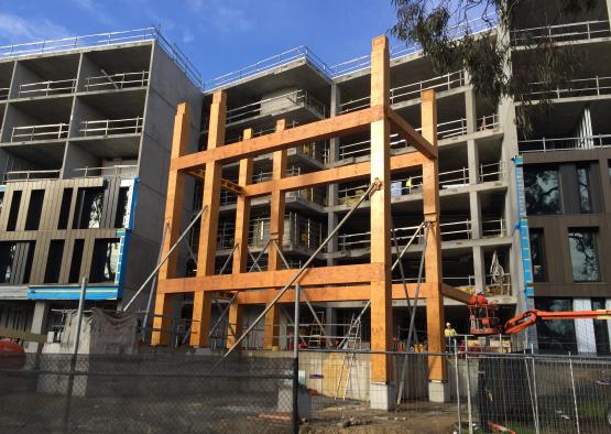 The four-storey post and beam timber structure erected for RMIT’s Bundoora Campus serves as a striking focal point for the University’s newly constructed student accommodation complex. A custom roof framing system was used along with pre-fabricated floor panels, radiata pine LVL beams and columns over eighteen metres in height, making it one of the largest engineered timber structures in Australia. The massive exposed LVL timber beams which can be seen from many levels internally as well as from the street, produce a stunning contrast to the surrounding steel and coasted aluminium cladding and creates a grand yet comfortable interior.