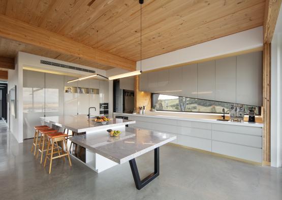The interior of Royd’s Clan House is a real celebration of the structural system, and the mass timber materiality. The angled form of the CLT shear walls is made ever more present in the interior spaces. Angled walls pepper the interior, creating unique sight lines through to the environment beyond, and adding a sculptural and considered feel to the home.