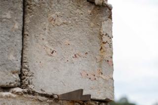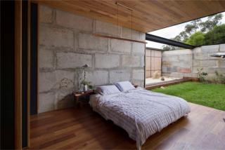 The rough blocks form a distinctive exterior to the house, being far larger than bricks and, due to their recycled nature, having slightly different hues and shapes. The retaining wall is also built from the same recycled blocks.