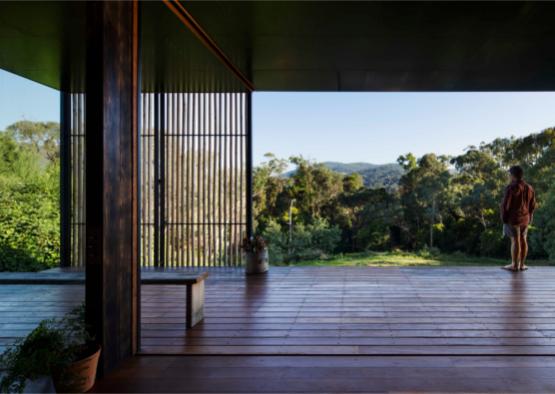 A nine-meter wide door leads onto the verandah. It can be completely opened up, creating a large entertaining space looking out over the surrounding bushland.