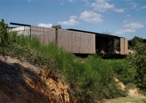 The house is built as one large room with panels spaced at certain points that can pivot, forming walls that can divide the room into separate spaces or allow the wind to cool the entire space as required by the occupants.