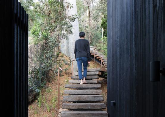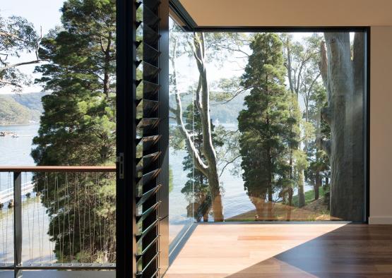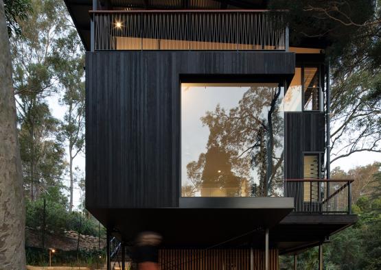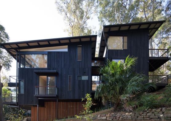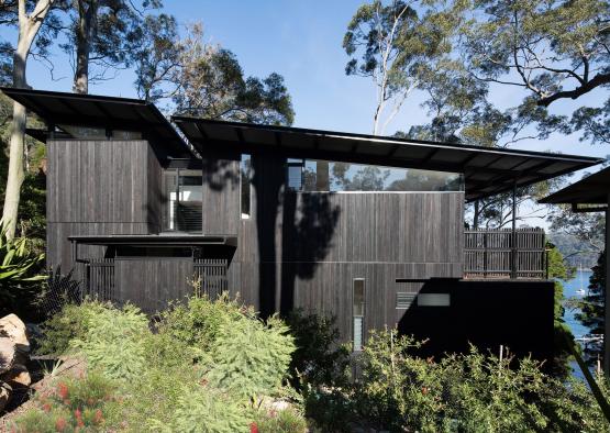 Recycled timber was chosen for its durability, sustainability, and appearance. It reduces the need for virgin timber, increases carbon storage, and significantly decreases overall greenhouse gas emissions through transportation. The unique location of the site (Scotland Island is only accessible by boat) meant that a lightweight cladding system, such as timber, was a natural choice.