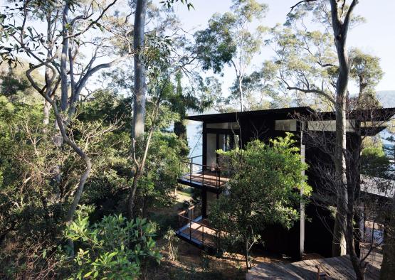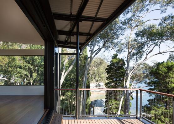 The Scotland Island House sits upon a steep, densely wooded, north-westerly facing site in Sydney, overlooking Pittwater and the Kuring-gai Chase National Park.