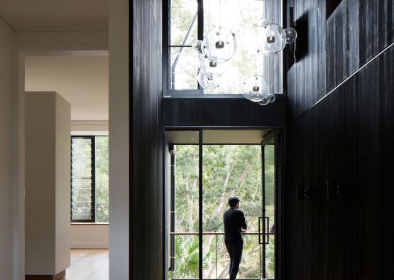 The interior space greatly juxtaposes with the rough nature of the charred cladding. White walls, high grade spotted gum veneer joinery, and glossy polished gum floor boards producing a sophisticated interior palette. Generous openings provide extensive views throughout the incredible location, with forest greenery seeping into every nook of the home.