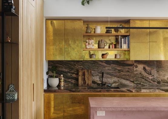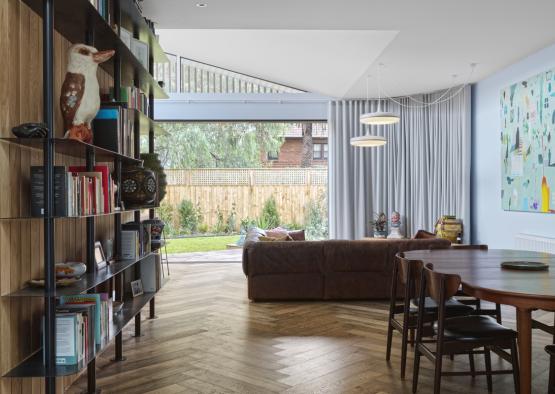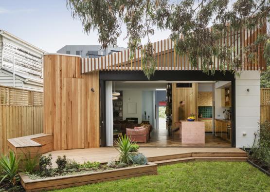 This renovation to a double fronted Victorian home in St Kilda seizes the opportunity for natural light and enjoying the immediacy of garden from within. Walking through the home the ceiling plane over shifts to create a heightened volume over new living and kitchen spaces, while creating an alternative wide outlook of sky. The raked ceiling volume reveals a luxurious kitchen, indoor planter and highlight windows over that capture northern light deep into the living and allow ventilation.