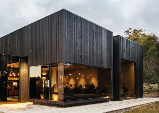 Vertical timber weatherboards have been stained black to produce a recessive and harmonious facade. The subdued palette soften the building into the landscape, allowing the historic Shorehouse building to take the lead.