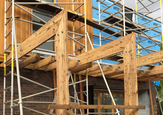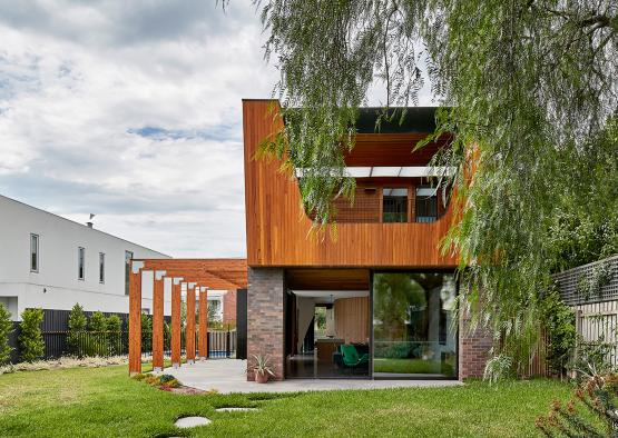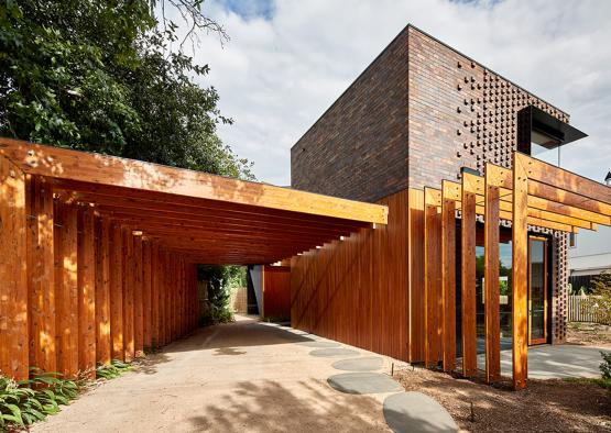 Structurally, Shrouded House relies heavily on engineered timber products. The floor system is comprised of Glulam joists and bearers, while the rafters and roof system is made from LVL beams. Wall elements are mainly masonry construction. The external pergola is also constructed from Glulam beams.