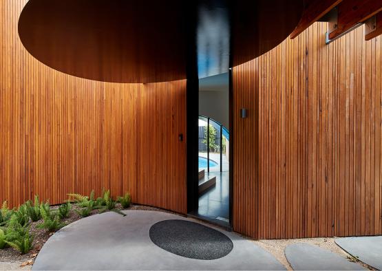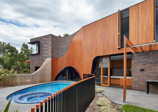 The existing timber fence on the property featured a curvilinear form, which was exploited by the architects, and used as a starting point for a curvilinear motif throughout the residence. The curved line is continued around the edge of the pool, before dramatically sweeping upwards into the facade, occasionally revealing rugged brickwork behind the timber cladding. The same technique is used to reveal window openings dotted throughout the facade.