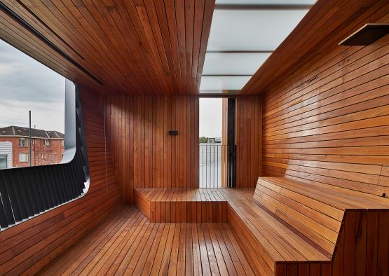 Cladding on the exterior of the structure and fencing is shiplapped silvertop ash. An outdoor living room on the first floor is both deck and living space, and is entirely clad in dressed silvertop ash.