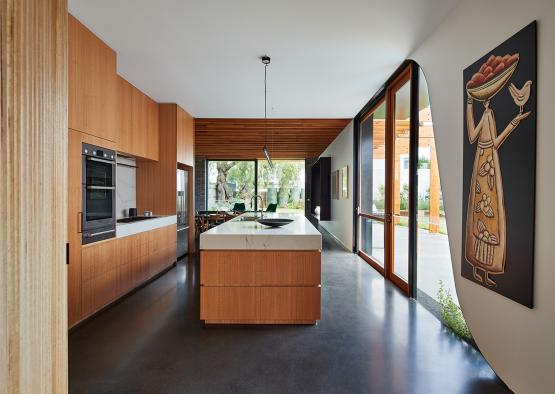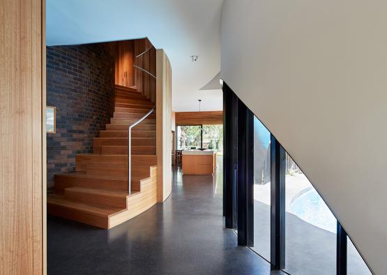 The curved motif continues throughout to the interior the residence, forming the main feature element of the entrance; a curved timber and brick wall forming a grand staircase. Exposed timber beams are a recurring aesthetic element of the interior spaces, particularly the generous downstairs living spaces.