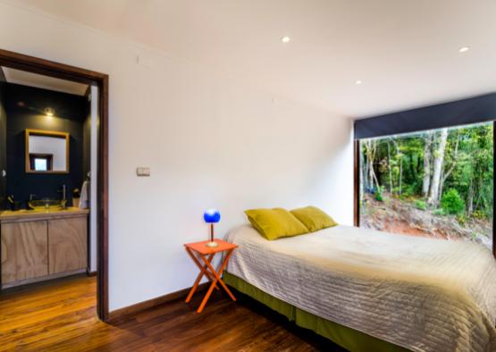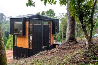 As the building sits on a sloping site, the side that faces up the hill is relatively closed off, with the entrance walkway crawling down to meet the porch. However, the opposite side looks out over the forest and takes advantage of panoramic views with wide windows.