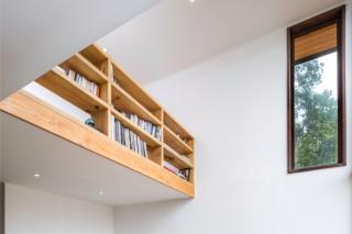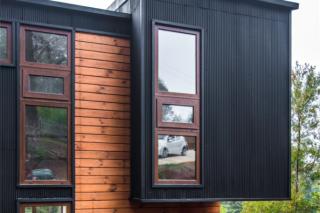The exterior of the house is an arresting patchwork of different timbers and timber products, with a rainscreen that stands a short distance away from the timber walls. Parts of the screen are made from a thermally-modified wood (TMW).