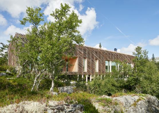 The project has been clad with ‘Skigard’. Skigard is a material typically used by Norwegian farmers. The long and narrow (typically 3m long) quarter-cut tree logs are traditionally laid out diagonally as fencing. The studio researched Skigard as a construction material in an effort to try to find examples of it being used as a cladding material, but were unable to find it used outside of fencing, which fed their desire to use the material differently.