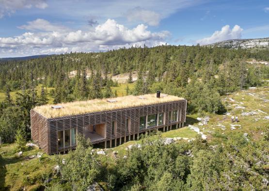 As well as cladding all surfaces in wood, the architects chose to also reference traditional Scandinavian sod roofs for a more natural feel. This was one of the few materials allowed for roofs by the local planning authority, and helps with heat retention in the winter and storm management in the summer. The green roof plantings gently sit over the top of the cladding, further embedding the structure in its surrounds.