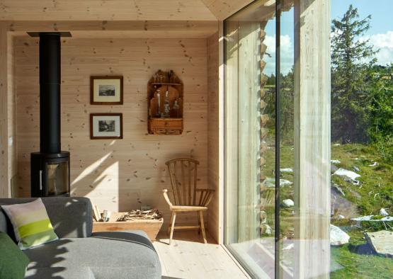 Floor-to-ceiling windows are used throughout the rooms of the house. In the main room, the windows extend six metres in length, bathing the cabin in natural light and revealing scenic mountain views. The glazing is triple-layer argon insulated glazing, which gives it excellent thermal properties for the harsh winters.