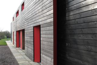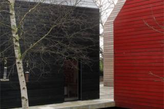 The outcome is three conventional building forms with unconventional detailing, radical performance, and a big surprise. A linear building of apparent simplicity is sliced into three programs; house, garage and annex. The shifted garage creates a courtyard between the three. The composition is further defined by material and color; red rubber membrane and glass, red and black stained larch.