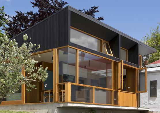 Timber was chosen because of visual and tactile considerations – warmth and texture of timber versus alternatives such as aluminium; the traditional window material in keeping with yet contrasting in style and natural finish with white painted windows of existing colonial era house; and the integration with timber framing and cladding.