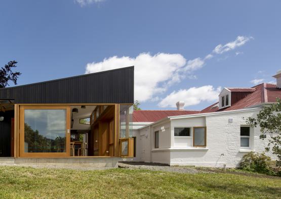 A variety of Tasmanian Oak timber windows and doors have been used externally and internally to the new timber framed and clad pavilion addition as well as for new doors to existing locations within the existing colonial period house allows a diversity of light, views, ventilation and engagement with the outdoors.