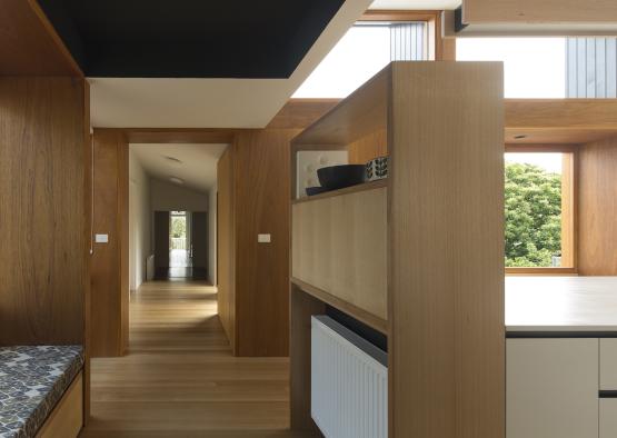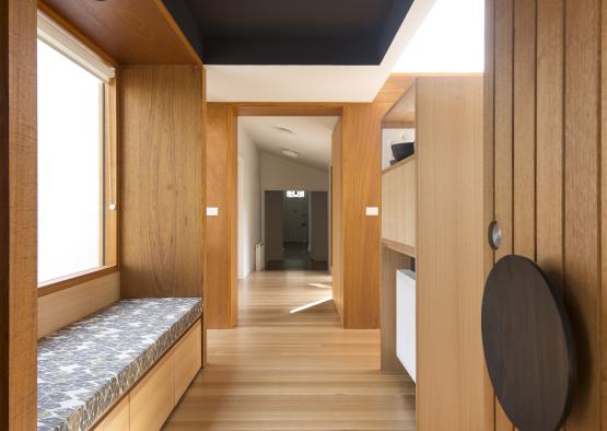 Select Tasmanian Ash veneered panels have been used for the kitchen joinery and window seats as well as for the exquisitely detailed and made pivot doors to the New Entry and Corridor.