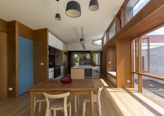The natural finish of the timber panels acts as a foil to the dark stained exterior of the new Pavilion Addition whilst also being a contrast to the white painted walls of the existing colonial period house.