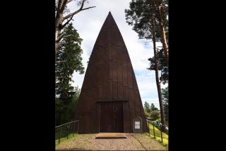 Sitting atop a forested island hill, the fish shaped chapel sits organically amongst the green foliage of surrounding trees thanks to the mellow patina of the copper roof. The wooden structure and interior lining is unseen from the exterior, yet the subtle beauty of the space is evident when approaching the chapel along the rising path.
