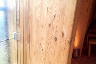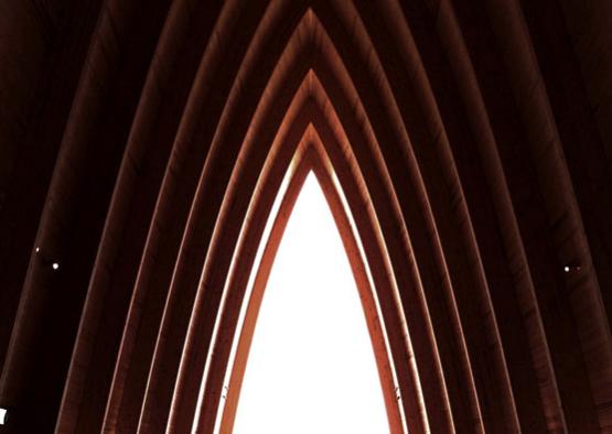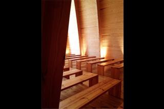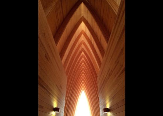 When entering the chapel the first sense to be activated is that of scent. The strong smell of pine is almost overwhelming, yet entirely understandable when one looks across and up through the arches. Nothing except pine and a ghostly overexposed altar are visible from almost every view point.
