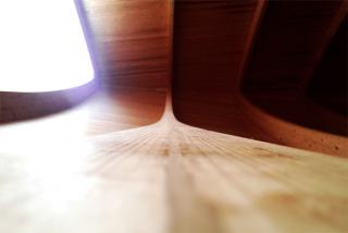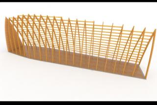 Sitting on concrete piles, the ribs are braced by horizontal structural wooden beams which then support the exterior copper skin and the cladding planks of the interior surfaces.