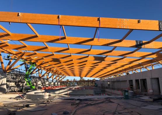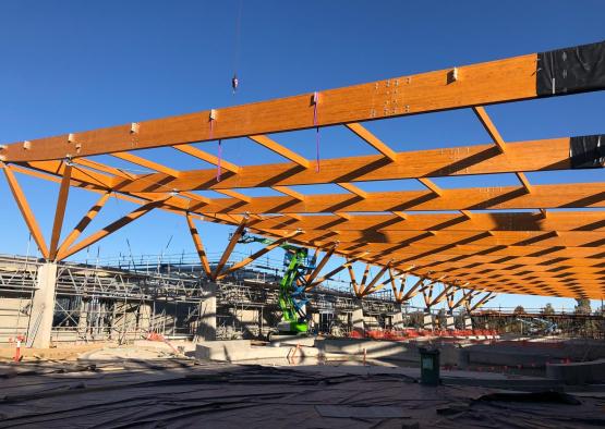 The roofing structure is composed of 47 metre main beams, spaced with 7 metre rafters. The entire structure is supported by tree-shaped engineered connections made of tapered glulam.