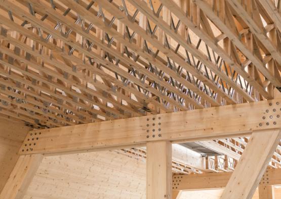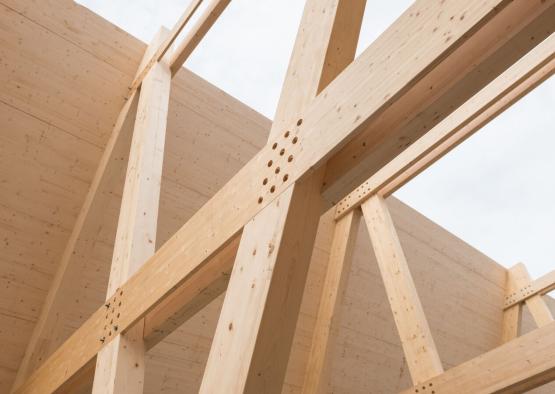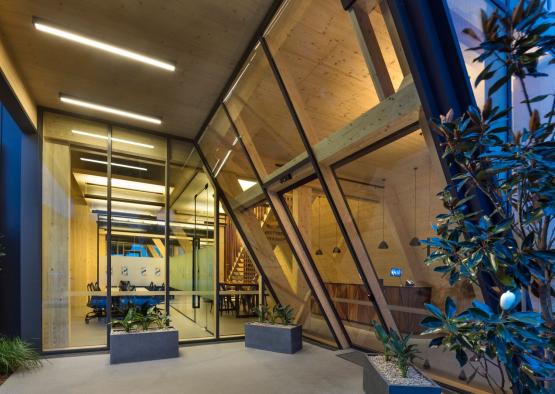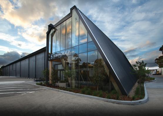 All of the structural elements of the Strongbuild office, including columns, beams, trusses, and wall and roof panels are made from engineered timber, either Glue Laminated Timber (Glulam) or Cross Laminated Timber (CLT). The two-storey, 600m2 office displays predominately exposed timber elements, with open floor trusses housing services.