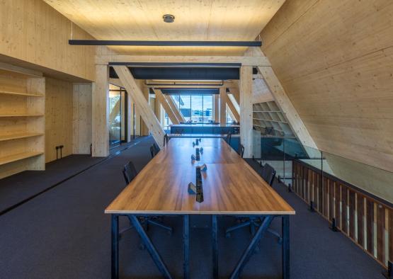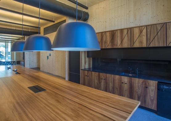 So much of the interior of the Strongbuild office is constructed from timber. Given that Stronbuild specialise in engineered timber construction, this project provided the perfect testing ground for structural, decorative, and detailed timber. Doors, shelves, table legs, and stairs were all made from spruce CLT, while Tasmanian blackwood became a recurring theme as an aesthetic timber. It’s dark profile and striking grain contrasted with the lighter spruce, and made it a great choice for bench tops, panelling, and stair hangers. Blackwood is also a reliable timber for workspaces as it responds well to wear.