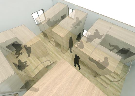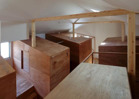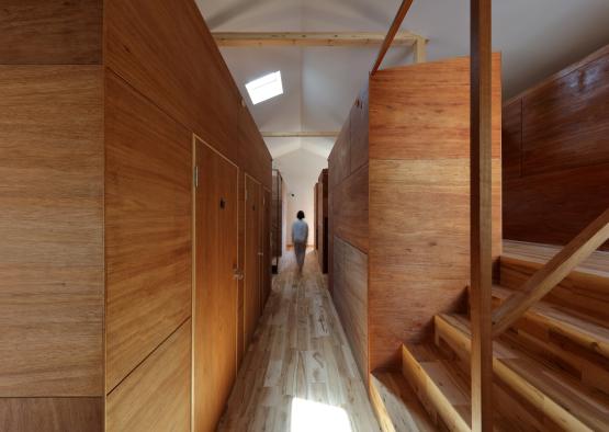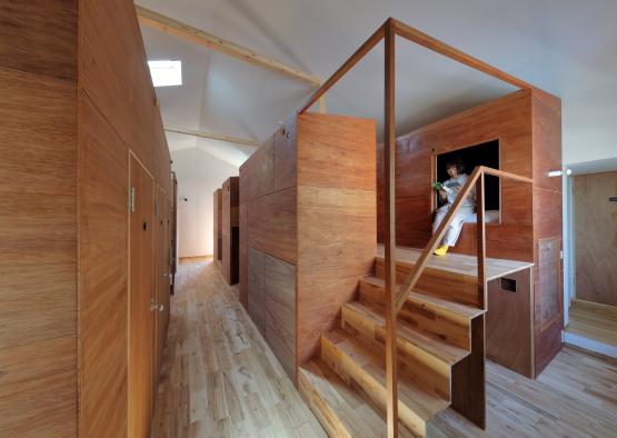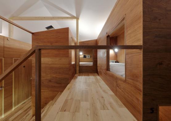 Like Koyasan guesthouse, the SUI guesthouse is a ‘village’ of boxes within a larger envelope. Pine posts form the main structural members, with structural plywood forming the walls of the variety of sleeping boxes. Handrails, stairs and joinery are all made from timber.